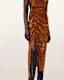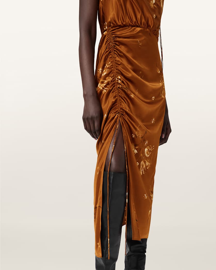 A timeless silhouette, with a new twist. The Laura Dress is cut from a silk-blend fabric with a slash neck and one shoulder detail. A drawcord skirt allows for flattering ruching to define the shape.