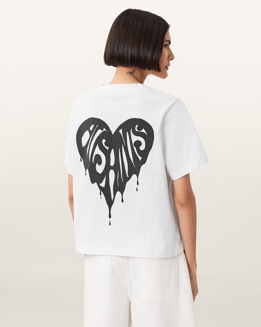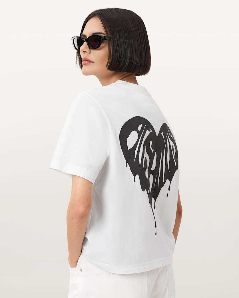Boxy shapes never fail. Meet the Lisa T-Shirt, it's a staple to our essential jersey collection. Crafted from organic cotton with a crew neck and short sleeves, it's finished with a distinctive AllSaints heart graphic on the left chest and on the back. Wear it with low-rise jeans, relaxed tailoring and leather loafers – a go-to look you can count on.