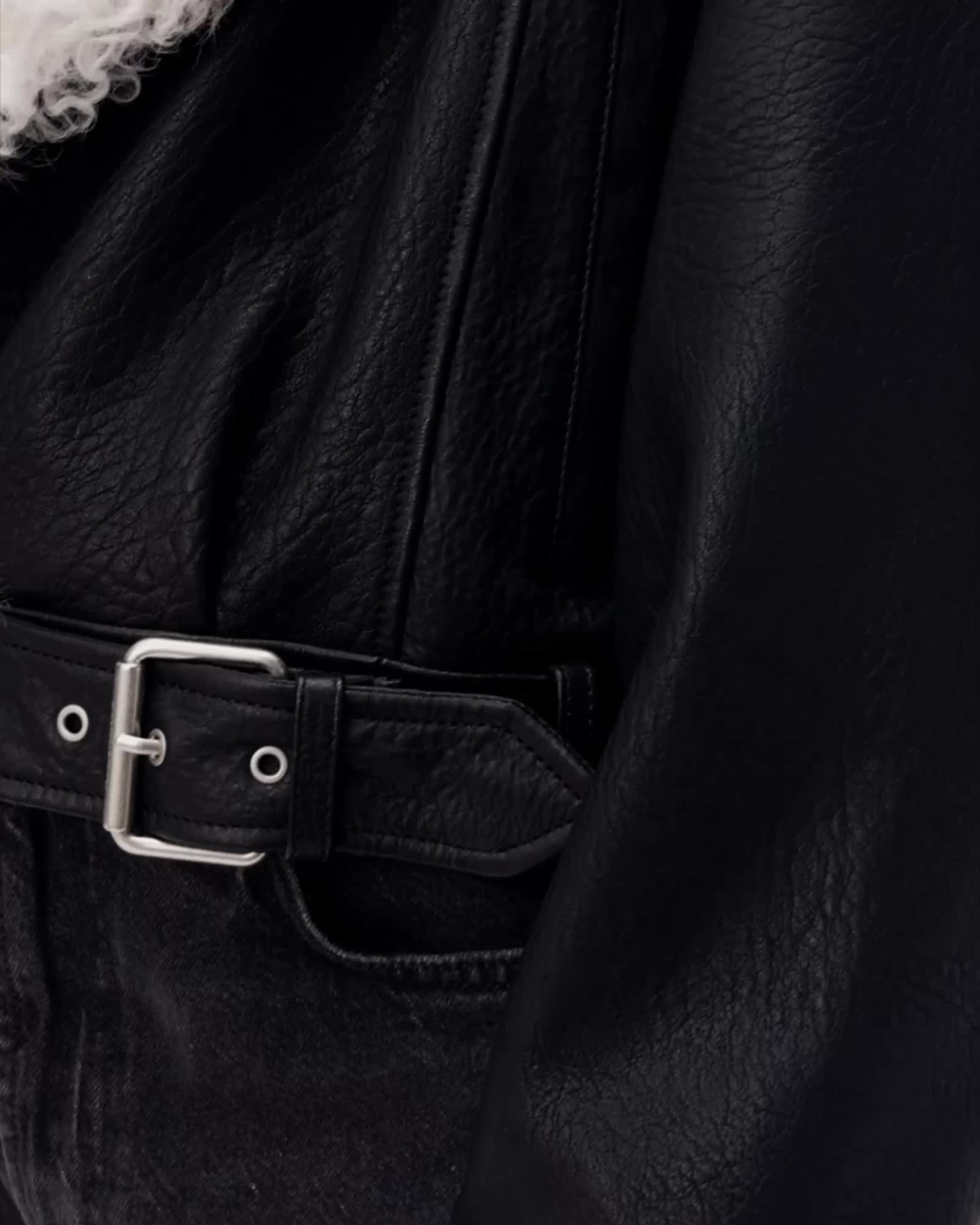 Soft comfort meets standout design for our Libra jacket. Flawlessly crafted from supple, grained leather with a large shearling collar and a scooped neckline. A seasonal must-have.