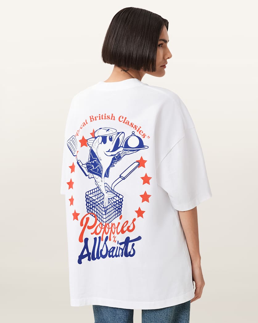 Two Spitalfields originals collaborate to bring you a graphic tee: introducing the AllSaints X Poppies T-Shirt. Crafted from soft organic cotton and cut to an oversized silhouette, this special edition tee features a hand-drawn graphic of a fish rocking a leather jacket, in honour of the iconic London fish and chip shop. Style out the summer months in this tee and denim shorts – you won’t need to fish for compliments.