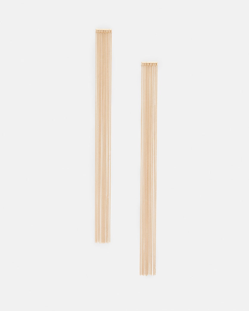 Undeniably elegant - make the Eliza Earrings the finishing touch. Made from recycled materials, delicate fringed chains fall from the ear in a warm gold-toned finish. They're extra long, making them the perfect accessory to pair with our statement slip dresses and heels (top tip: show them off with your hair up). Earrings Post back closure Extra long Fringed chain design AllSaints engraved signature Gold tone finish