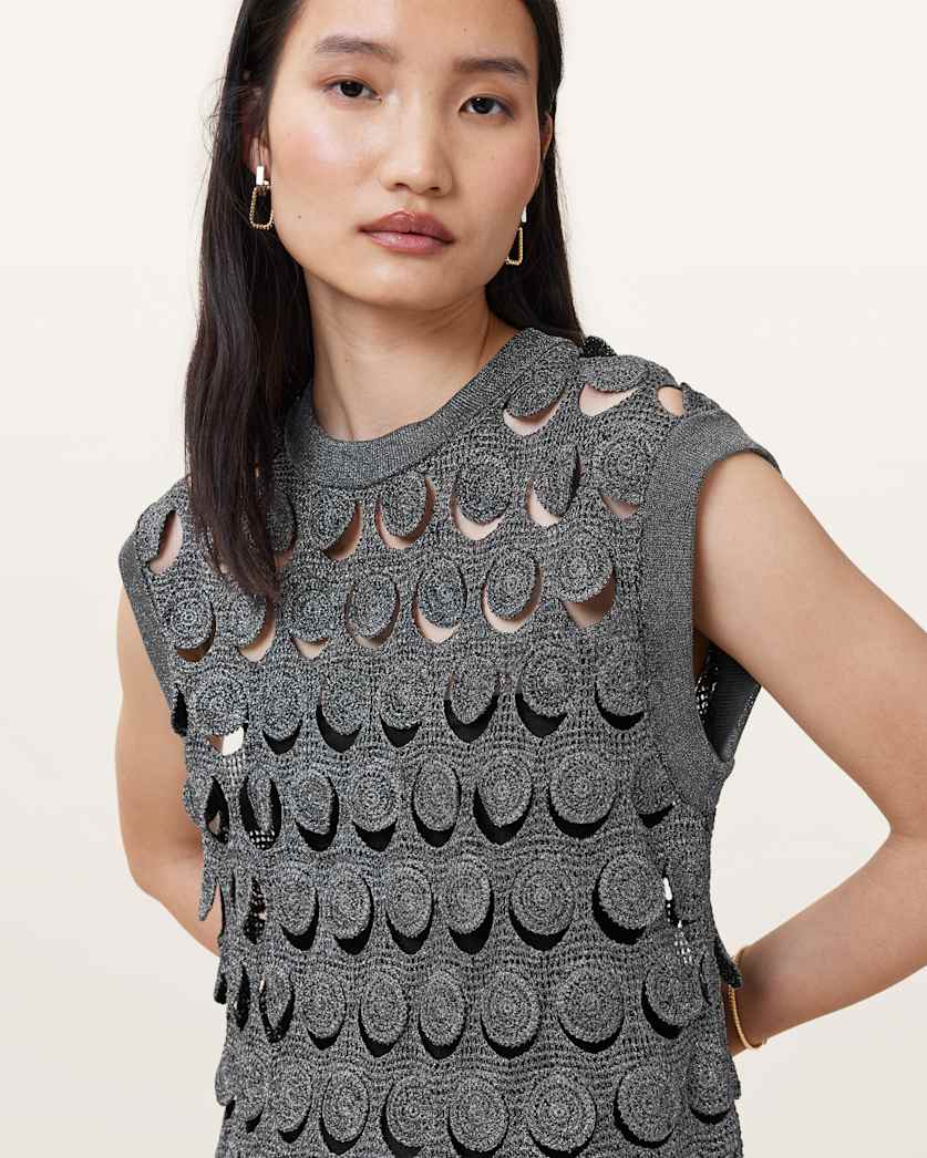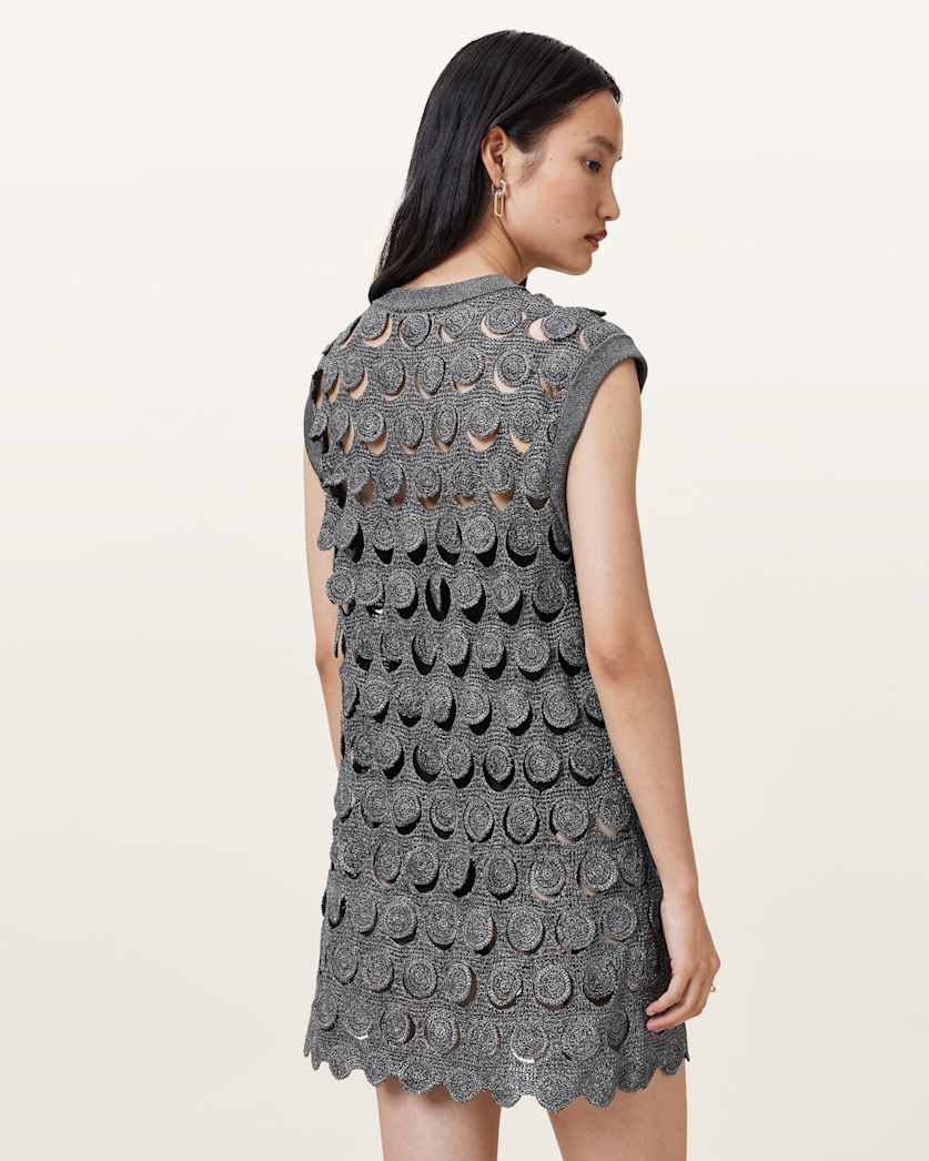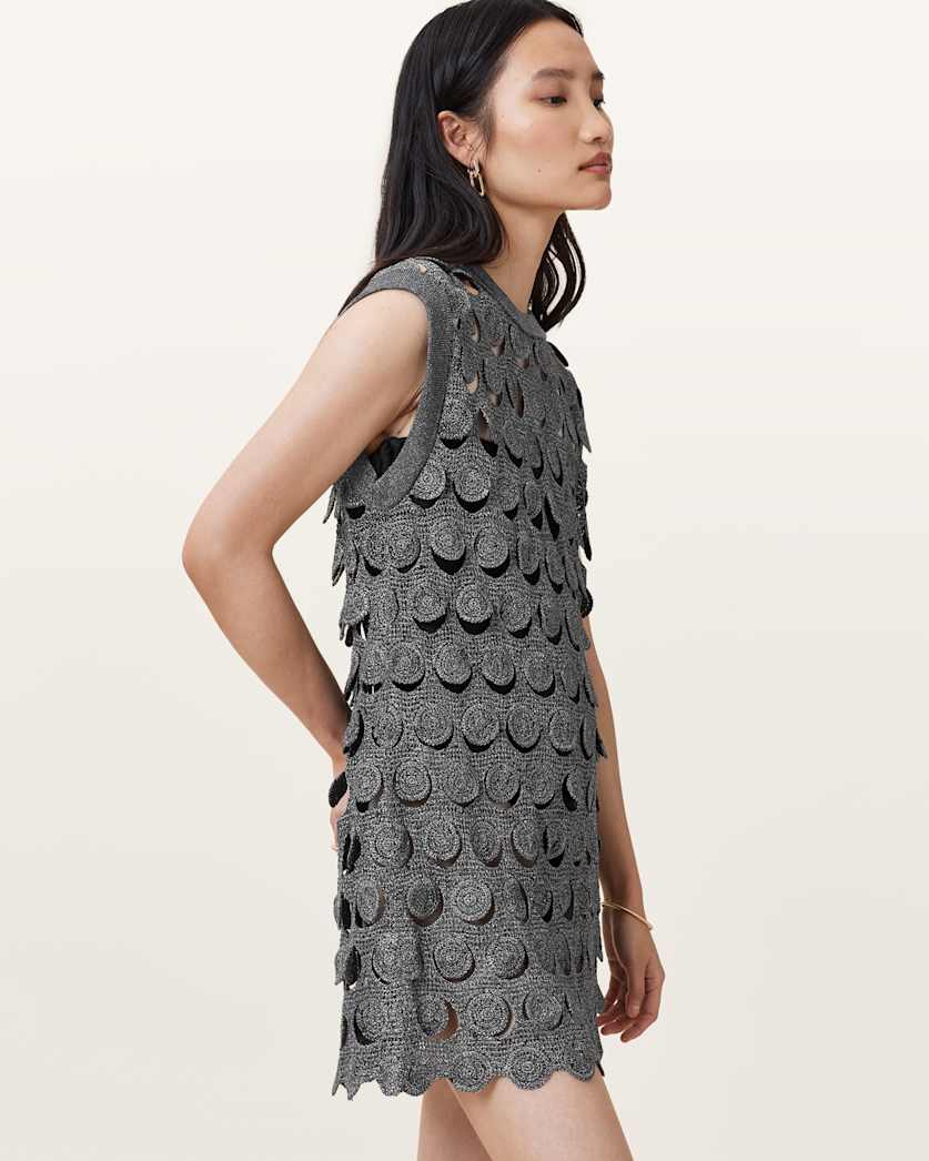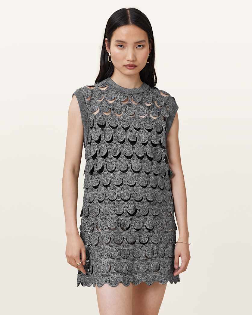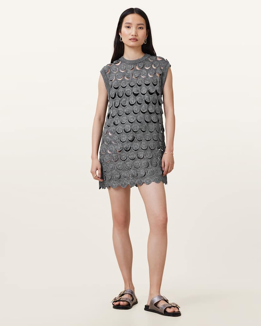 The Iris Mini Dress – a piece crafted for festival season. Styled with boots, this sparkly gunmetal crochet mini dress is framed with a luxury finish.