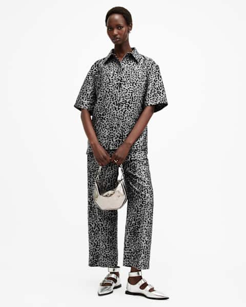 The feel of luxury. These are the Jemi – your new staple leopard-print trousers. They're made from part recycled fabric that's been completed with a metallic jacquard texture. The relaxed shape is full length and straight fitting with multiple pockets. Pair them with the matching shirt for an amped up take on casual dressing.