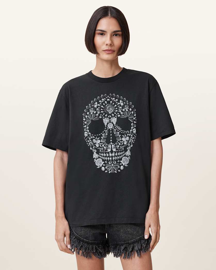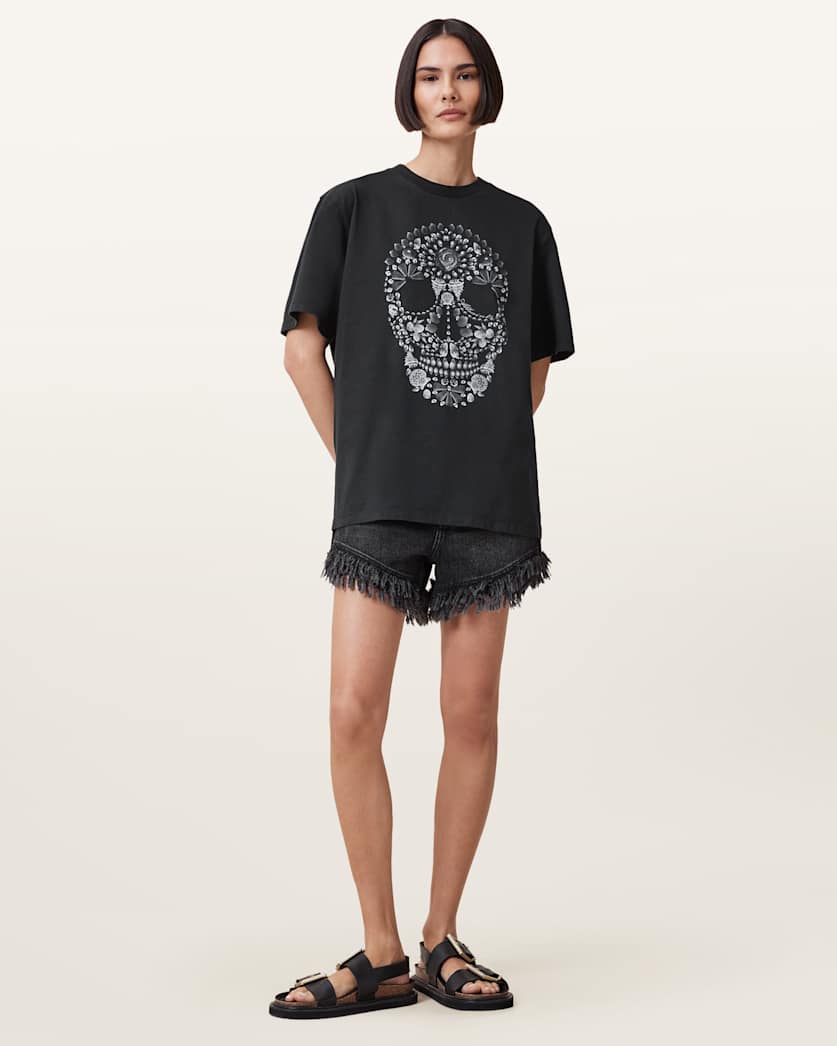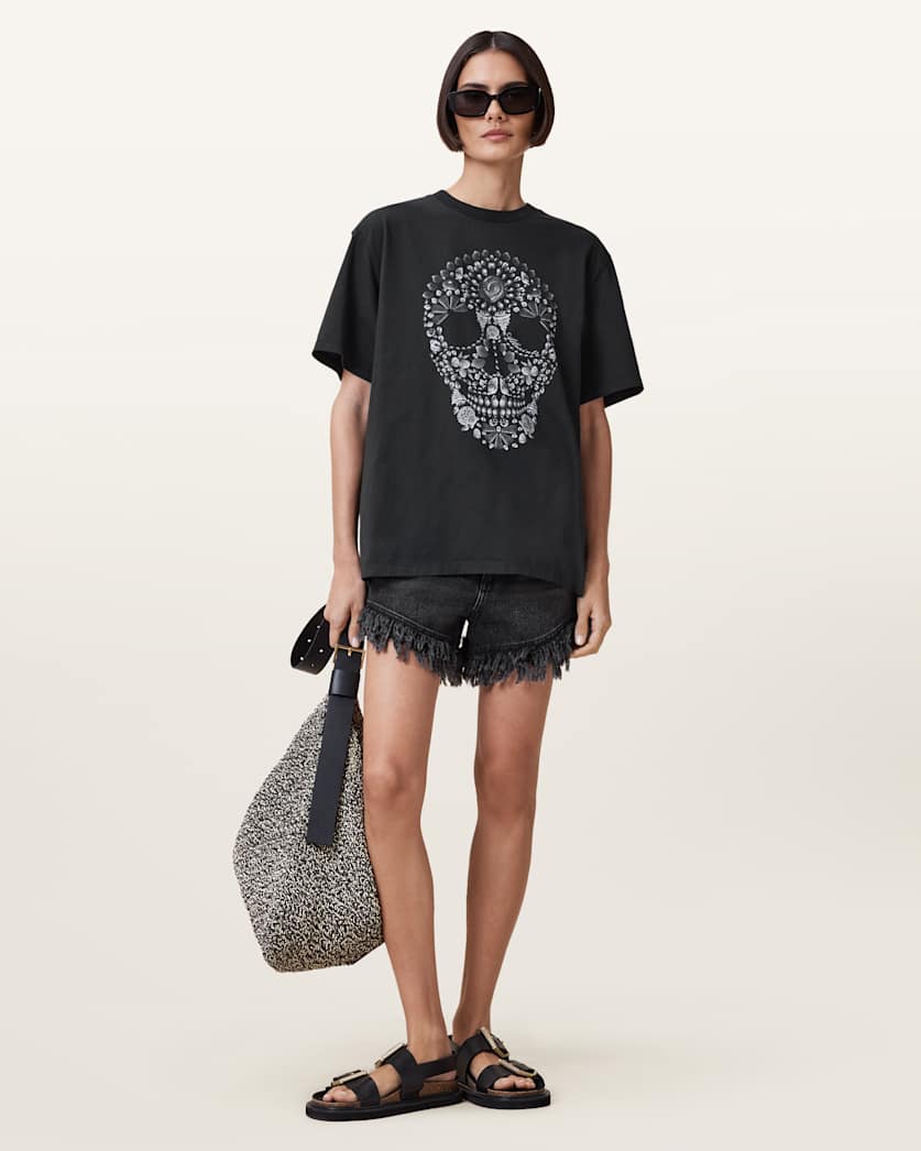 Every wardrobe deserves a statement graphic tee. Cut to a relaxed fit from organic cotton, our Shkull Boyfriend T-Shirt is adorned with an eye-catching skull graphic. Paired with frayed denim shorts, your gig attire never looked so rock n roll.