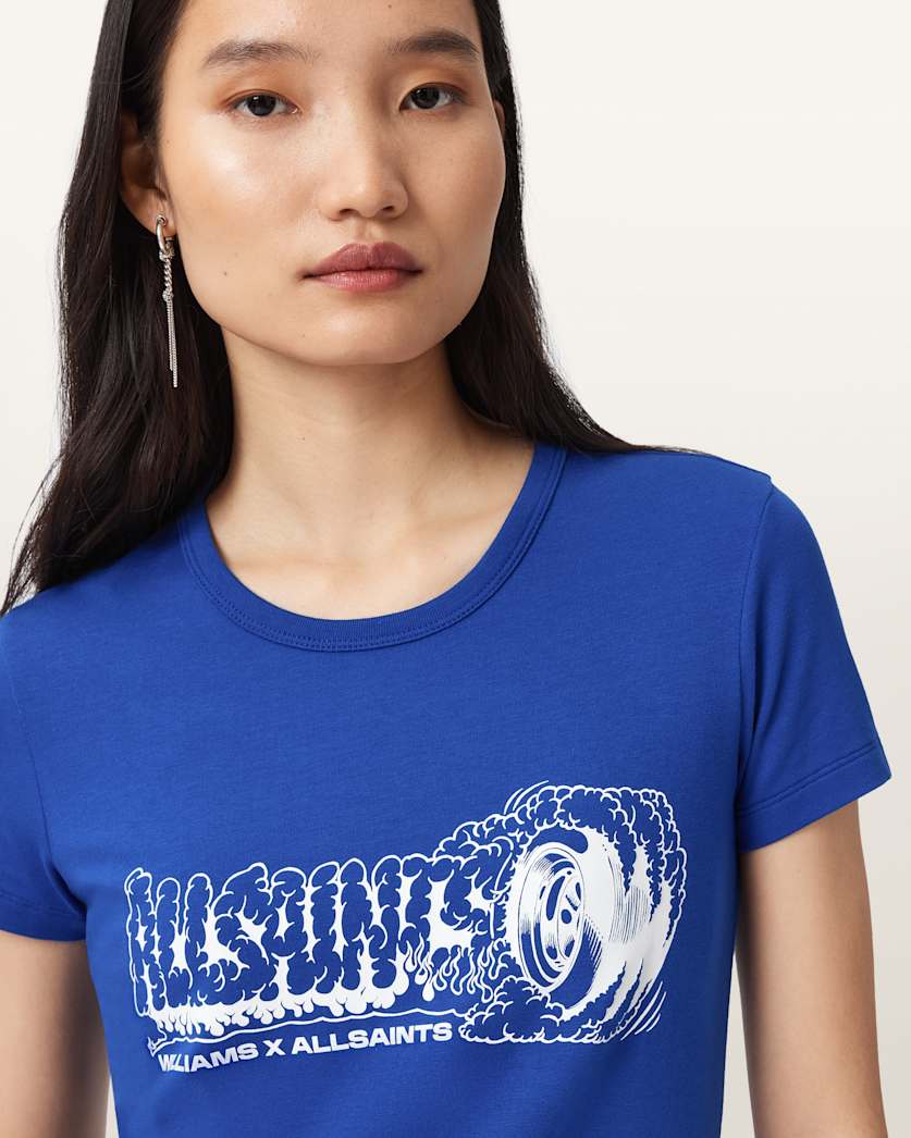 Introducing the Williams X AllSaints Burnout Stevie T-Shirt, part of our collaboration with Williams Racing – one of the world’s leading F1 teams. Featuring the Williams X AllSaints logo and our new Burnout motif, this t-shirt is only a pit stop away from completing your summer outfit.
